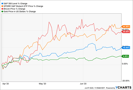 Just take a look at the chart below, which shows the biotech industry’s outperformance versus the S&P 500 … gold … and even bitcoin since March! The latter two are often viewed as hedges during tough market environments.