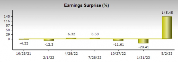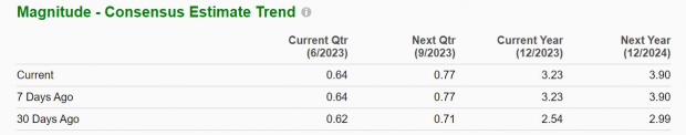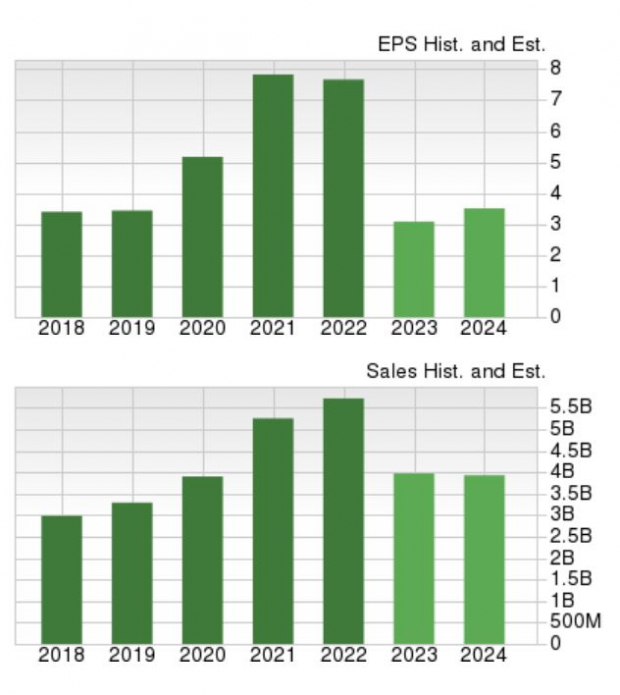 Fiscal 2023 earnings estimates have jumped 27% over the last 30 days with FY24 EPS estimates climbing 30%. Earnings are now expected to drop -58% this year at $3.23 per share after an extremely tough-to-compete-against year that saw EPS at $7.67 in 2022. Still, fiscal 2024 earnings are forecasted to rebound and jump 21% at $3.90 per share.