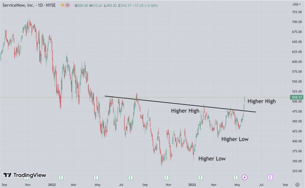 From a technical perspective, ServiceNow exhibits a very bullish chart pattern. The stock price has shown strong momentum, and just broke out above a level of resistance. Additionally, NOW has been stair-stepping higher since the beginning of the year building higher lows and higher highs, indicating increasing demand for NOW shares. It is clear that selloffs are met with robust buying.