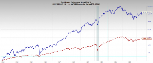 NOW stock has been an exceptional performer in the last 10 years. Over that period, it has compounded at an annual rate of 29.7%, far outperforming the broad market.