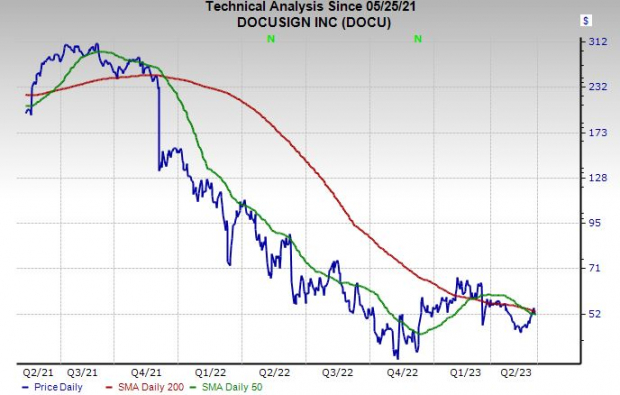 Zacks estimates call for DocuSign’s revenue to climb 7.3% this year and 8% next year. The slowing revenue growth comes as DOCU faces a difficult-to-compete-against stretch, a slowing economy, and growing competition from the likes of Adobe (ADBE) and other large, more diversified tech companies.