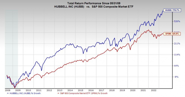 Hubbell stock has climbed roughly 735% in the last 20 years, with a total return of 1,300% vs. the S&P 500’s 330% and 575%, respective gains. HUBB also outshined its Zacks Industrial Products sector on both metrics over these timeframes. HUBB’s outperformance remains firmly intact over the last 15- and five-year time periods as well.