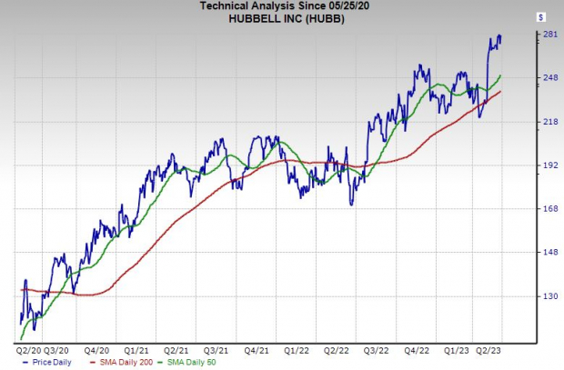 Current Zacks consensus estimates call for Hubbell to post another 30% adjusted earnings expansion in 2023 and 8% higher sales to see it pull in $5.36 billion. These projections follow 18% sales expansion last year and 14% growth in 2021, alongside double-digit EPS gains.