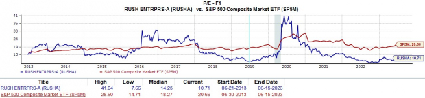 While Rush is trading modestly above its industry average of 7.2X forward earnings the company is a leader in its space and trades well below the benchmark’s 20.6X. Furthermore, Rush stock trades 75% below its decade-long high of 41X and at a 25% discount to the median of 14.2X.