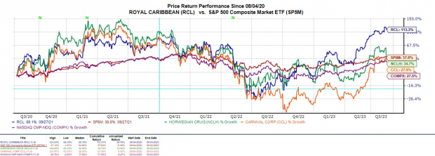 Royal Caribbean stock has wiped away any losses from the pandemic and is now up +113% over the last three years. This also tops the broader indexes, Norwegian’s +35%, and Carnival’s +28%. Despite this year’s impressive rally, Royal Caribbean’s stock still trades very reasonably at 18.6X forward earnings which is attractively below its industry average of 29.5X and the S&P 500’s 21.2X.