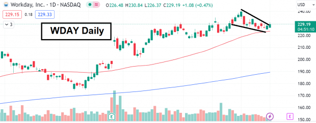 WDAY shares are retreating to the 50-day moving average for the first time in months. Typically, the first pullback to the 50-day moving average is an area of attractive reward-to-risk.