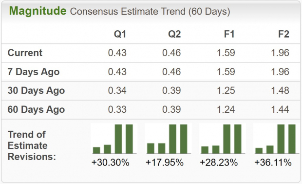 Vertiv’s earnings estimates have been climbing higher over the last two months, demonstrated by its Zacks Rank #1 (Strong Buy) rating. Current quarter earnings estimates have been revised higher by 30.3% and are projected to increase 87% YoY to $0.43 per share. FY23 estimates have been boosted by 28.2% and are forecast to grow 200% YoY to $1.59.