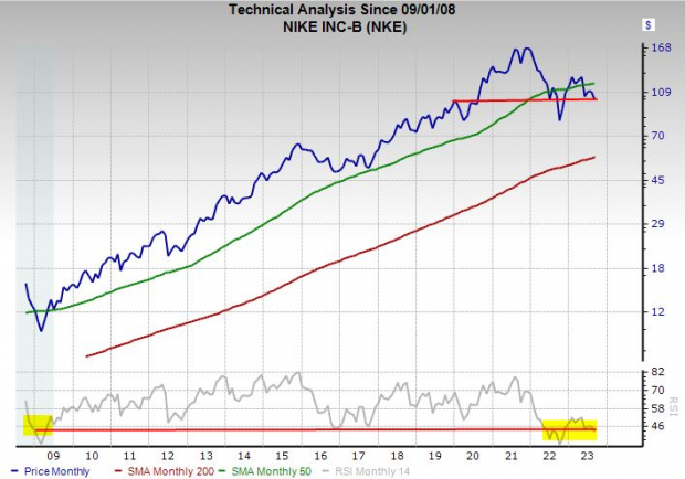 Nike shares are down around 40% from their highs and 30% below their average Zacks price target. NKE recently bounced out of oversold RSI territory, but it is still trading under some key short-term and long-term moving averages that might make some investors nervous to buy right now.