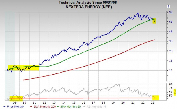 The downturn also has NEE sitting at long-term RSI levels that it last hit back in 2009 and 2010. And NextEra trades at a 40% discount to own its 10-year highs at 20.4X forward 12-month earnings and not too far above its median.