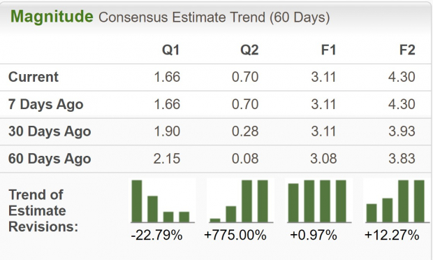 Current quarter earnings estimates have been increased by 65% and are projected to climb 660% YoY to $0.38 per share. FY23 earnings estimates have been upgraded by 50.5% and are forecast to grow 170% YoY to $1.46 per share.