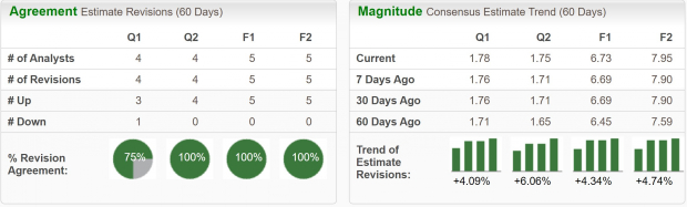 Current quarter earnings estimates have been raised by 4.1% over the last two months and are projected to grow 34% YoY to $1.78 per share. FY23 earnings estimates have been increased by 4.4% and are expected to climb 29% YoY to $6.73 per share.