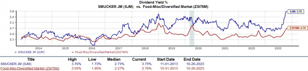 To that pont, J.M. Smucker is a leading manufacturer of consumer food, beverage products, and pet food with the company raising its dividend for 26 straight years. With a current annual dividend yield of 3.75%, J.M. Smucker’s payout attractively tops the Zacks Food-Miscellaneous Markets’ 2.76% while being significantly above the S&P 500’s average.